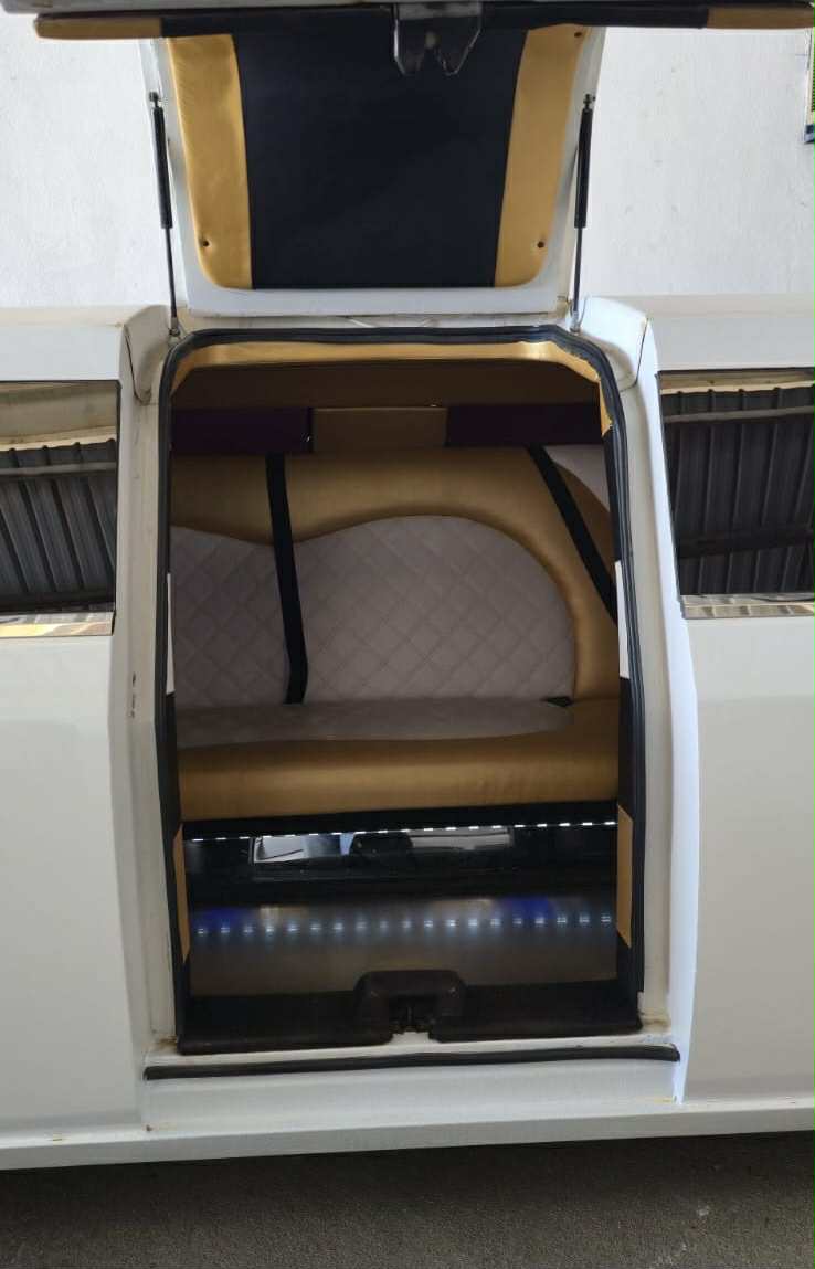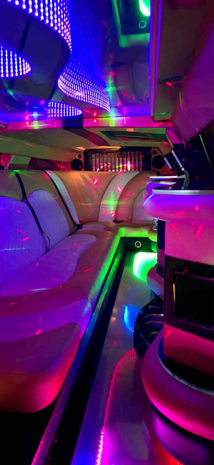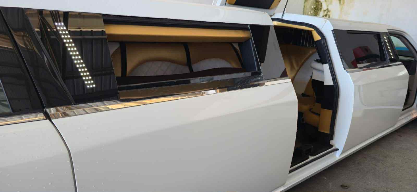 Limousine com um nível de preparação e personalização ao mais pequeno pormenor dentro desta gama, conta com cerca de 10 metros de comprimento, um luxuoso interior em pele de várias cores personalizado com vários espelhos e luzes rgb no teto, bar e chão, sistema de luzes led, bar completo com flutues e copos, frigorífico e varias arcas congeladoras, maquina de café, sistema de som completo com amplificador e sub com mais de 1000 wats de som da melhor qualidade para os passageiros, vários monitores android com usb, blhuetoht, intercomunicador com o motorista, vidros laterais com abertura para disfrutar da paisagem e refrescar todo o seu interior,